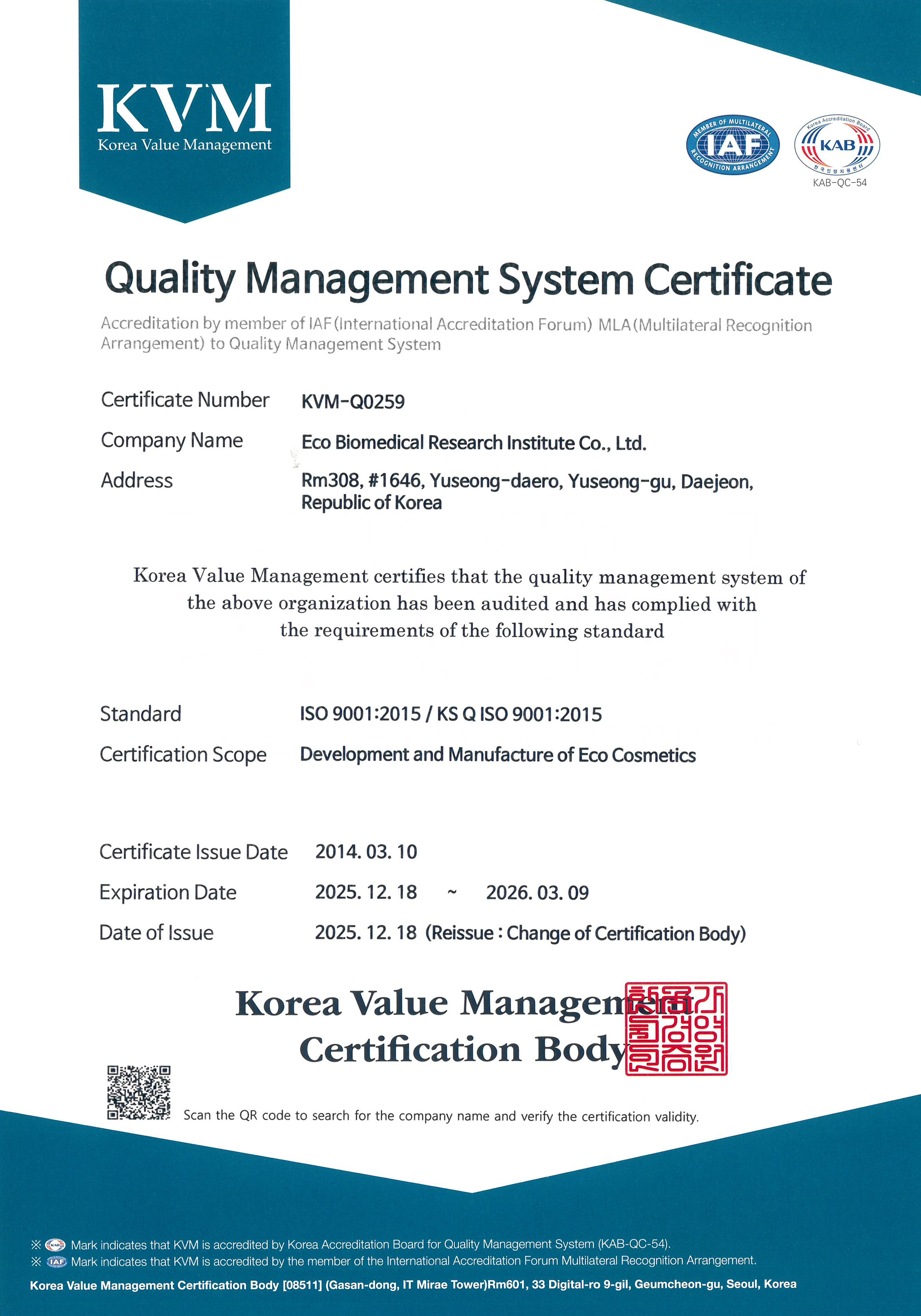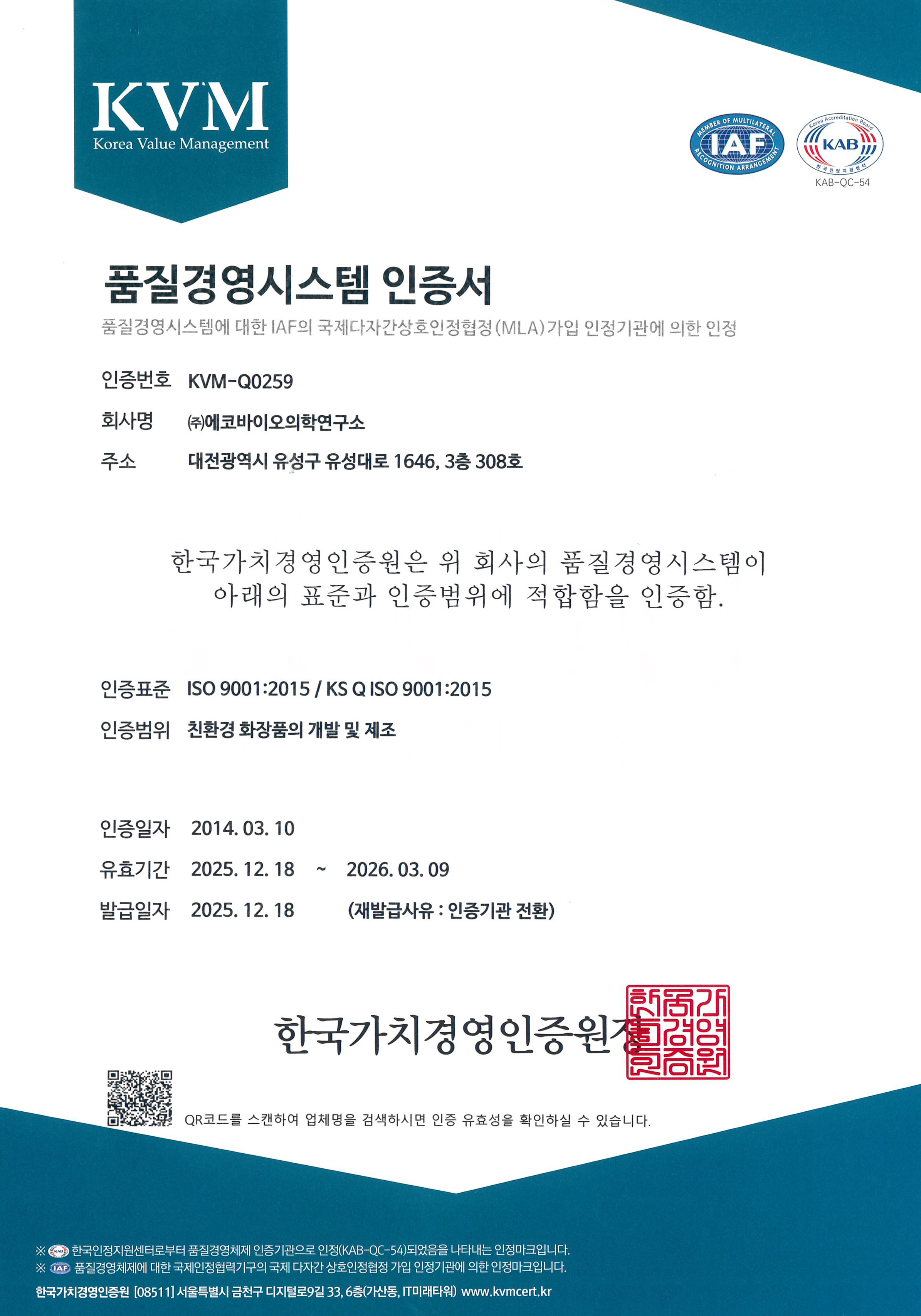 품질경영시스템 인증서