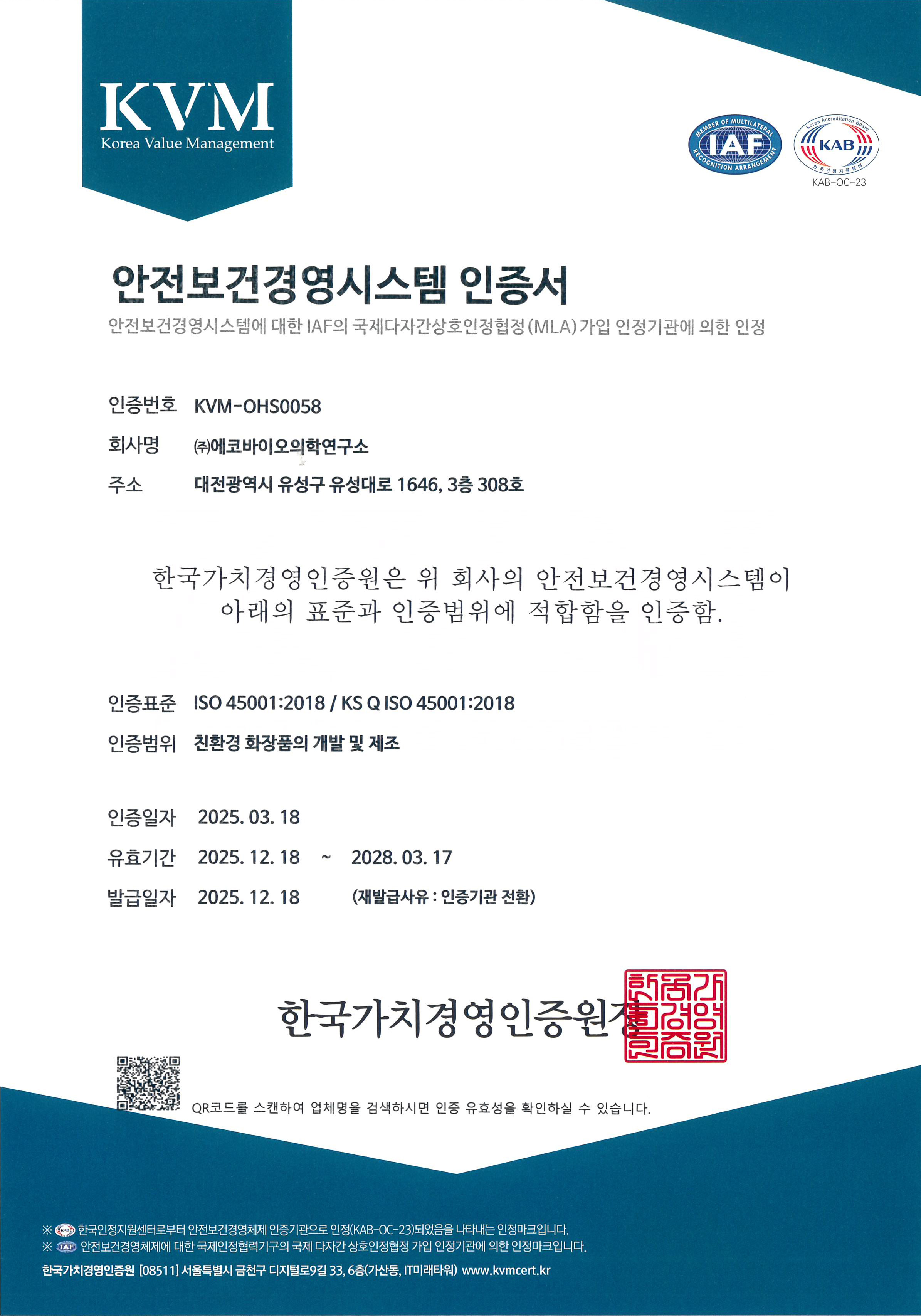 안전보건경영시스템 인증서